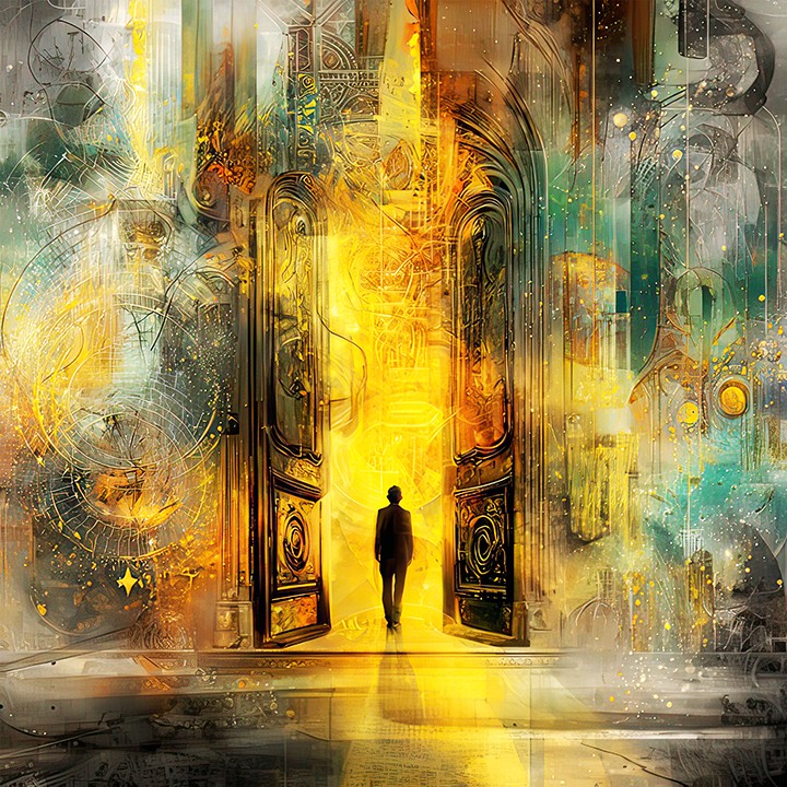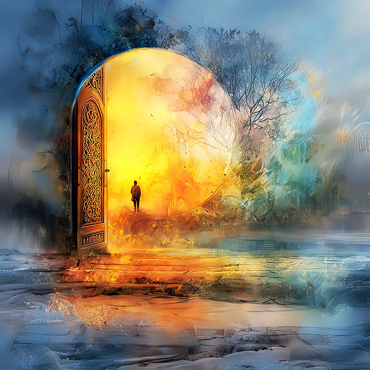 generative. a literal visualization of stepping into a new year. A glowing, ornate doorway standing alone in a mundane landscape, opening...