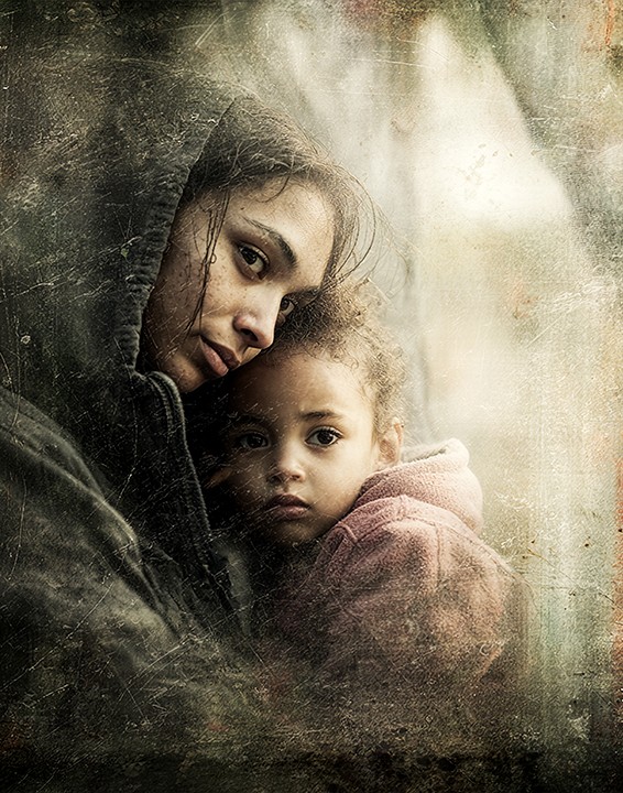 digital. A woman in a hooded garment holds a young child closely in a homeless urban neighborhood. The muted, earthy tones enhance the...
