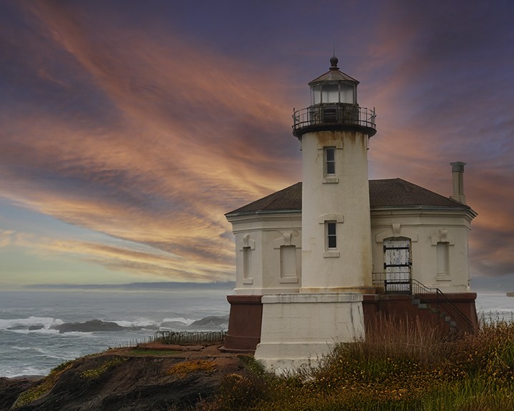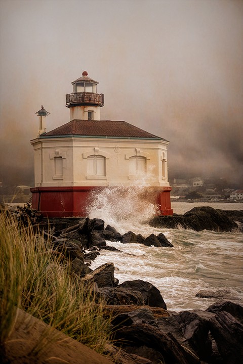 oregon. the coquile lighthouse stands firmly on the rocky coastline during a cold, blustery day, as waves crash against its base. Fog...