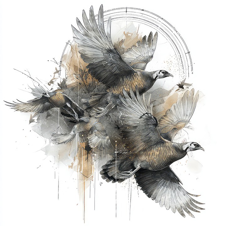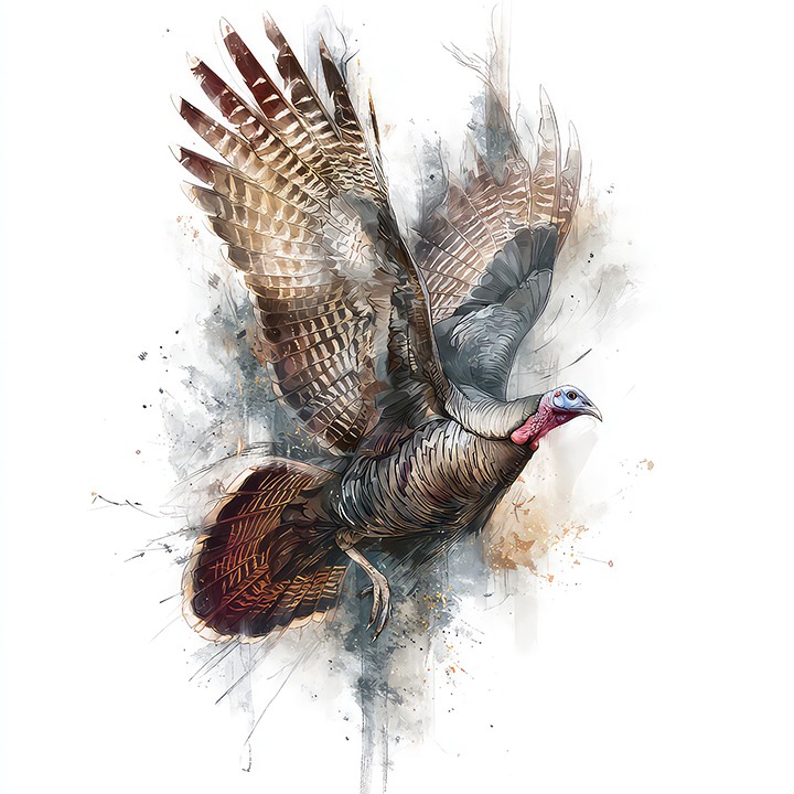 digital watercolor. a wild turkey is captured mid-flight, wings fully extended, showcasing its detailed feathers against a soft watercolor...