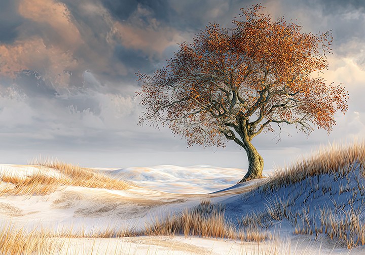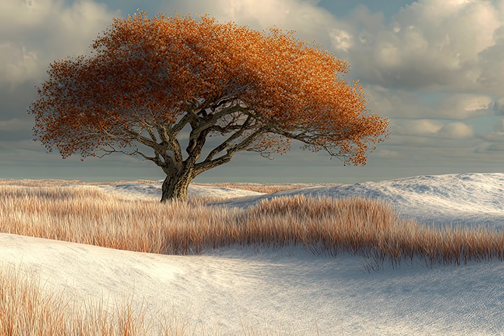 a hushed, soundless scene. A single tree stands in a snowy field, its autumn leaves orange, contrasting with the white snow and brown...