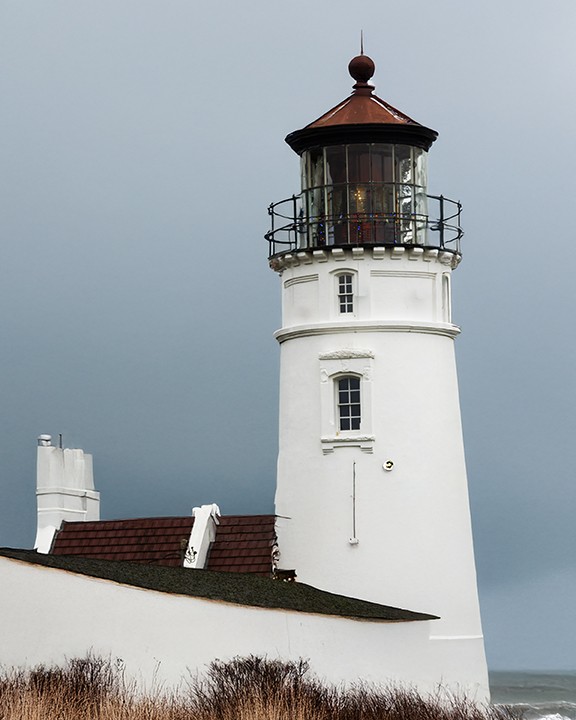 oregon. on a cold December afternoon, a majestic white lighthouse stands tall, its vibrant red roof set against a serene blue sky. It...