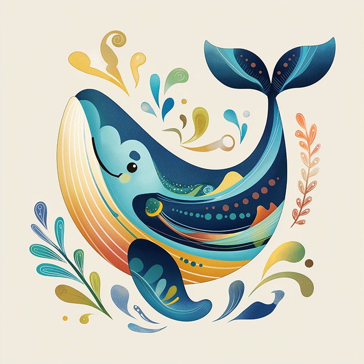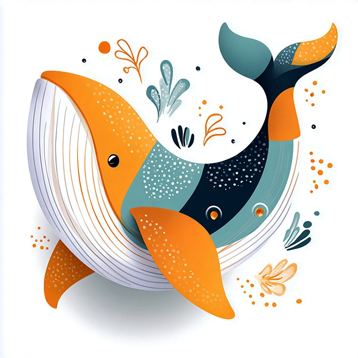 digital. a playful whale is depicted in a whimsical and colorful abstract style. Bright orange and teal colors with circular shapes enhance...