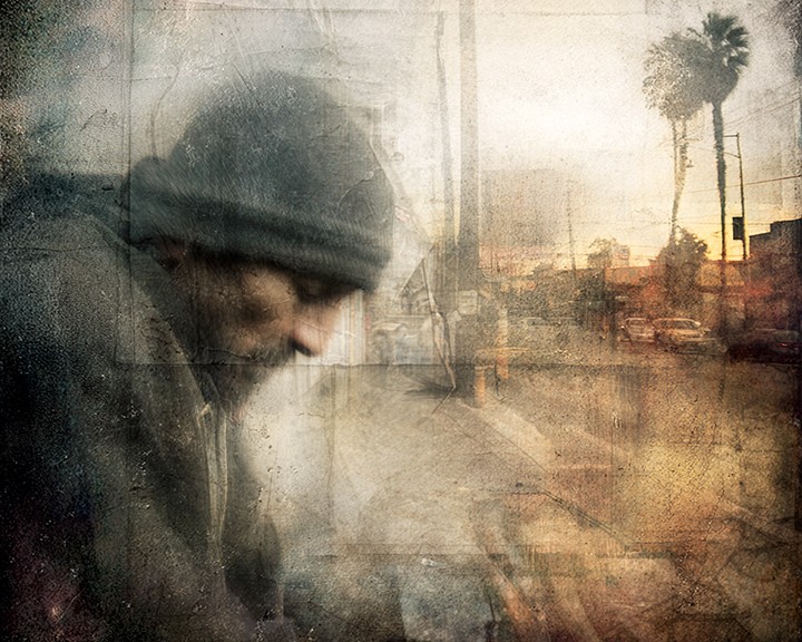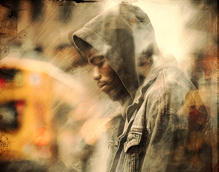 digital. a homeless man wearing a hooded jacket appears deep in desperate thought as he stands sideways on a city street. The background is...