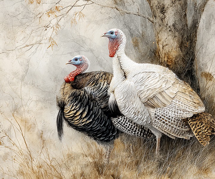 digital drawing. Two wild turkeys, one with dark feathers and the other white, are perched together in a serene natural setting during the...