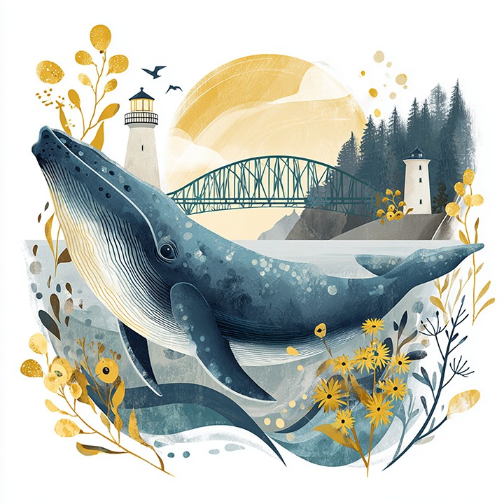 digital graphic. a stylized depiction of a majestic juvenile humpback whale swimming gracefully near a lighthouse on the coast. The scene...