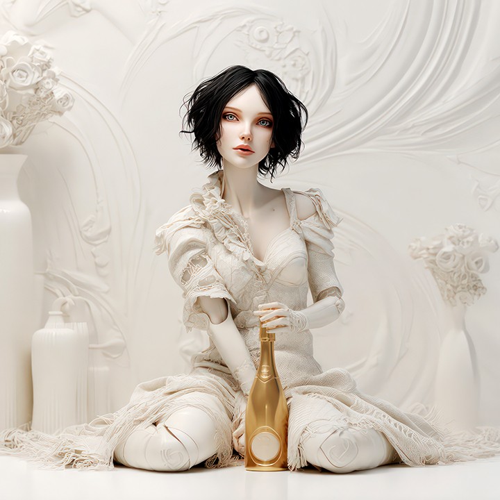 generative. a darling humanoid, dressed in white with dark hair, sits on a smooth floor, holding a golden bottle to toast a new year and a...