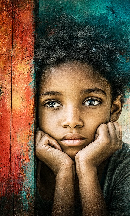 digital. a young girl gazes thoughtfully into the distance, surrounded by a vibrant blend of colors. Her curly hair and expression add a...
