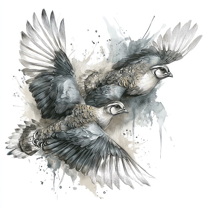 digital painting. two birds elegantly soar through the air, their wings fully spread and displaying intricate feather patterns and details...