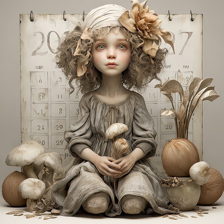generative. a hyperrealistic humanoid girl sitting on a pale white new year calendar, holding a weird-looking party toy. detailed...
