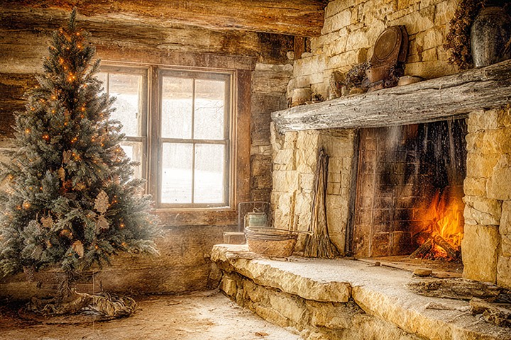 generative. a warmly lit ranch house cabin room features a decorated Christmas tree beside a stone fireplace. Stacks of wood and rustic...