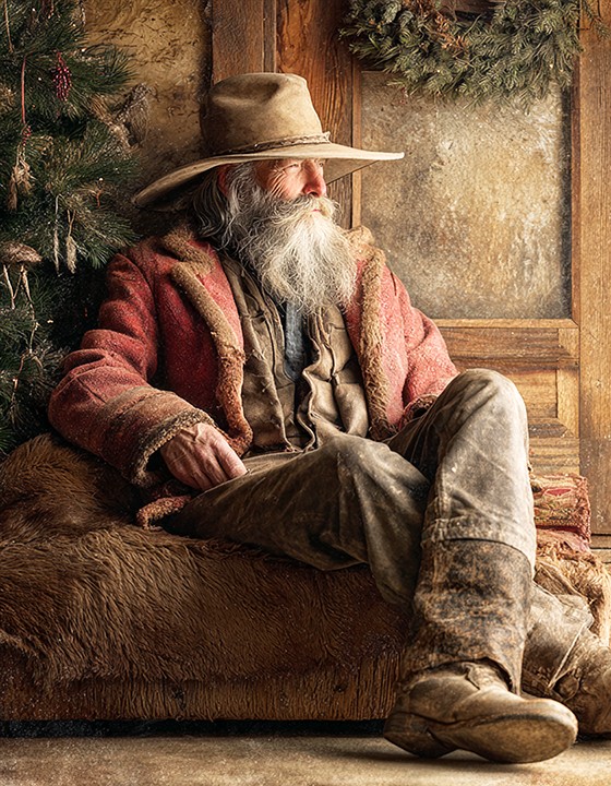 generative. a bearded man in a worn cowboy hat and red jacket sits relaxed on a hide-covered bench on christmas day in his cozy ranch...