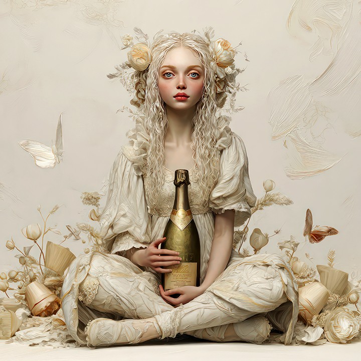 generative. a hyperrealistic humanoid girl poses on the ground with legs crossed, holding a champagne bottle. Flowers and butterflies...