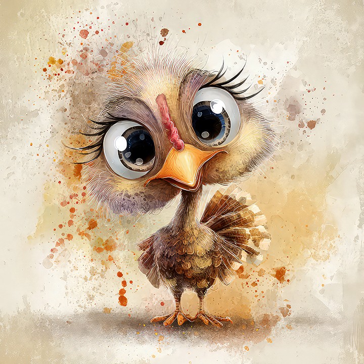 digital watercolor. a highly detailed, cute watercolor cartoon of an adorable baby turkey, realistic but softly stylized for children, with...