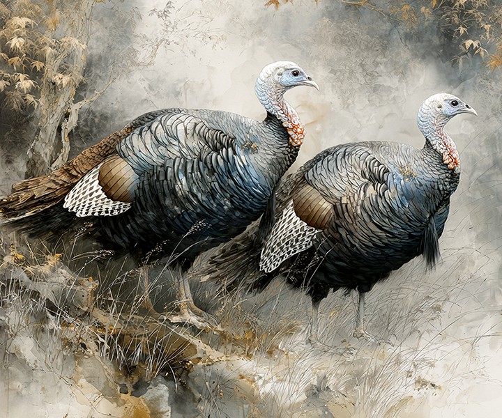 digital from my photo. two wild turkeys are seen standing together in a calm, natural environment. The scene captures the beauty of autumn...
